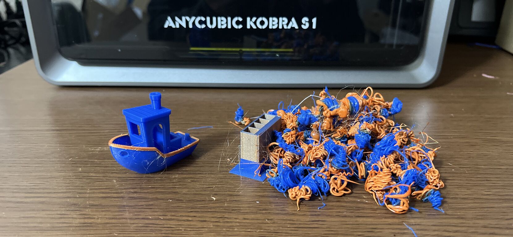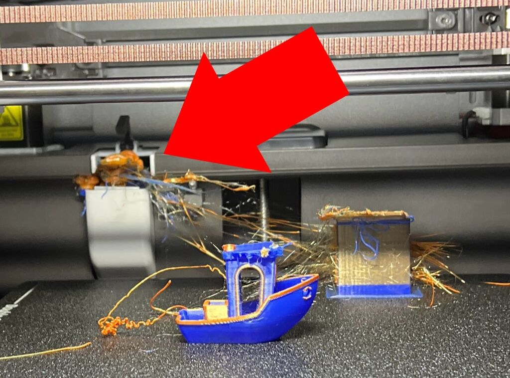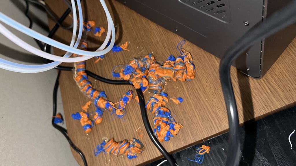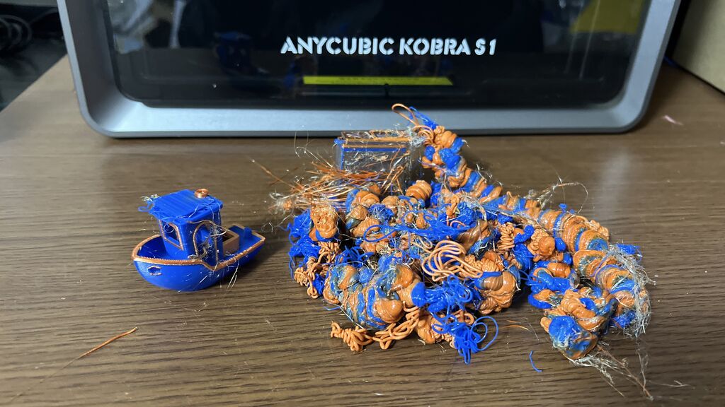 どうやら、色を変えるためにフィラメント材料を吐出して入れ替えるため、大量の廃棄ゴミが出るようです。3Dプリントする形状以上に廃棄する量の方が多い!凄い材料の使用量でした!
