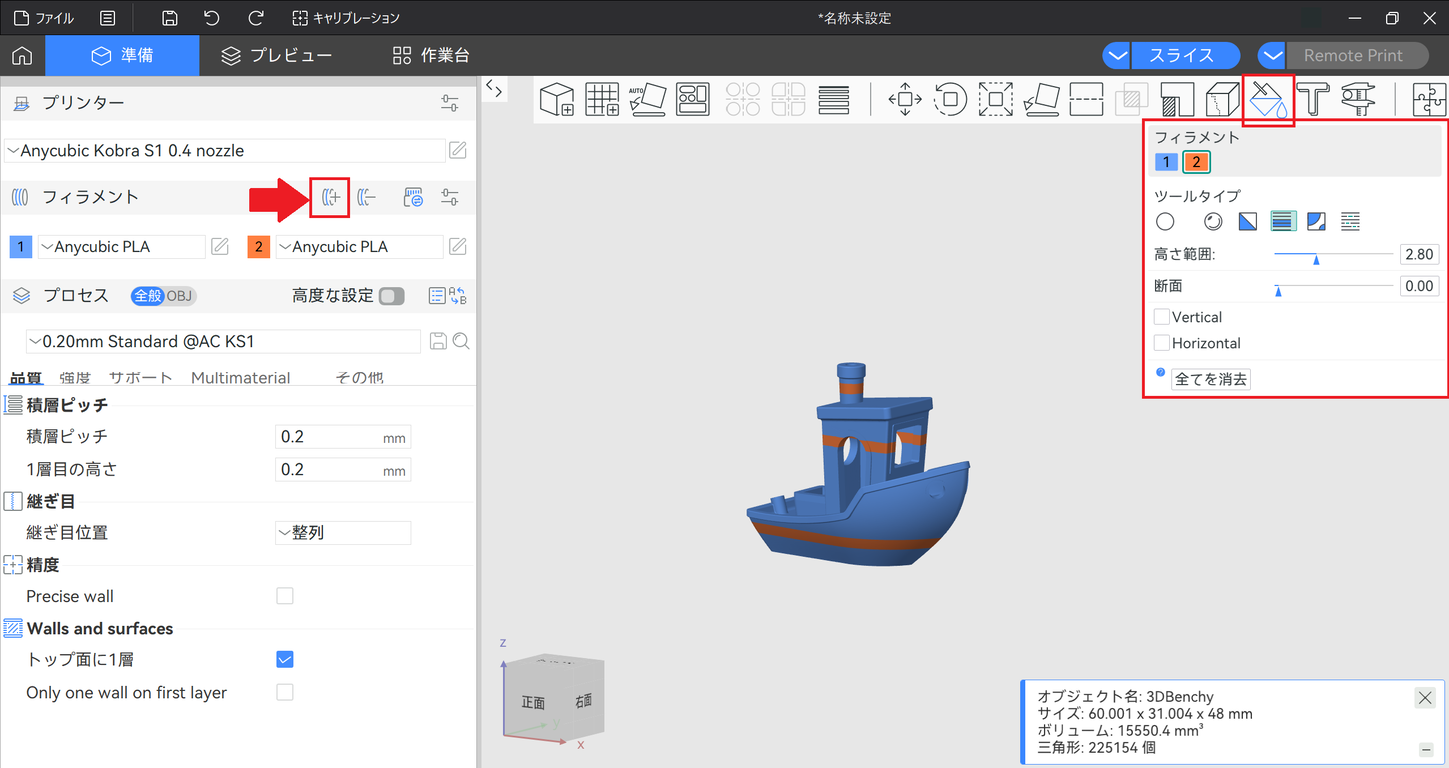 多色の設定をする方法は、フィラメントを追加することで、設定を行うことができるようになります。