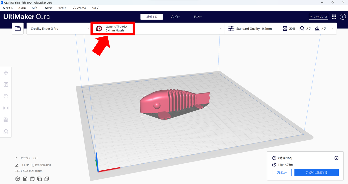今回、設定は材料設定の項目を汎用の「TPU95A」に変えただけでした。